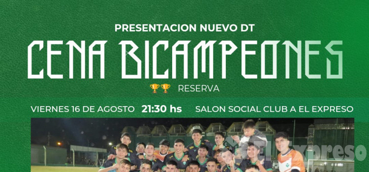 CENA DE LOS BICAMPEONES El próximo viernes 16 de agosto a las 21.30hs en el salón social se realizará la cena del Bicampeonato de Reserva y presentación del nuevo DT: Menú: choricito, pollo, ensalada, postre helado. Costo Mayores $...