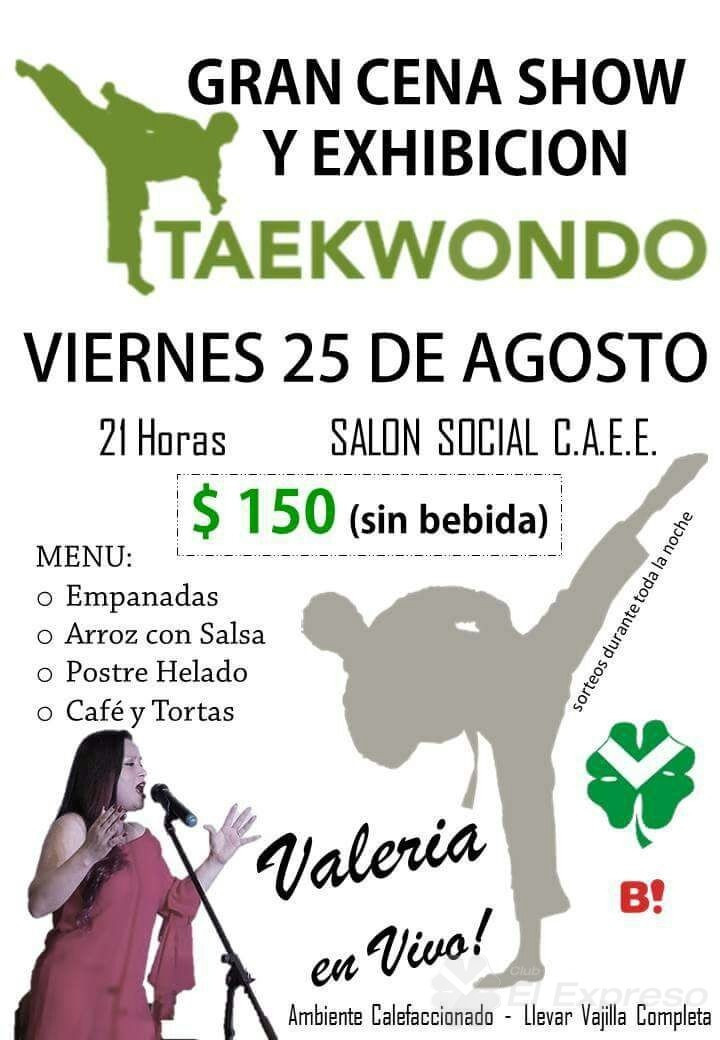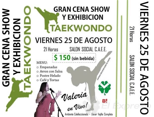 El viernes 25 de agosto a las 21hs en el Salón Social se realizará Cena Show y exhibición de taekwondo con la actuación de Valeria.