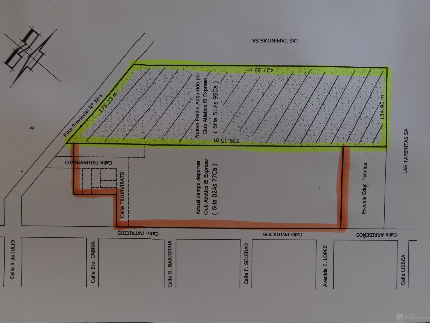 El club cuenta en la actualidad con 6 hectáreas a las que se suman estas 6.5 hectáreas -al Este del actual campo de deportes– las que se extienden desde la parte posterior de Escuela Técnica hasta el camino que conduce a Cañada Rosquín, es decir una extensión de 539,15 metros x 134,90 (En la foto se puede apreciar en naranja el actual campo de deportes y en verde flúor lo adquirido a la firma Williner) .