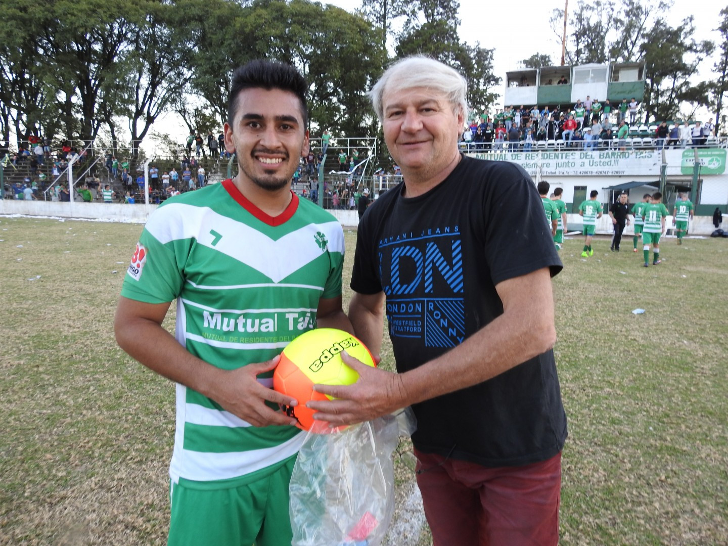 Richi -de FM 90.5- entrega la pelota al mejor jugador de la cancha