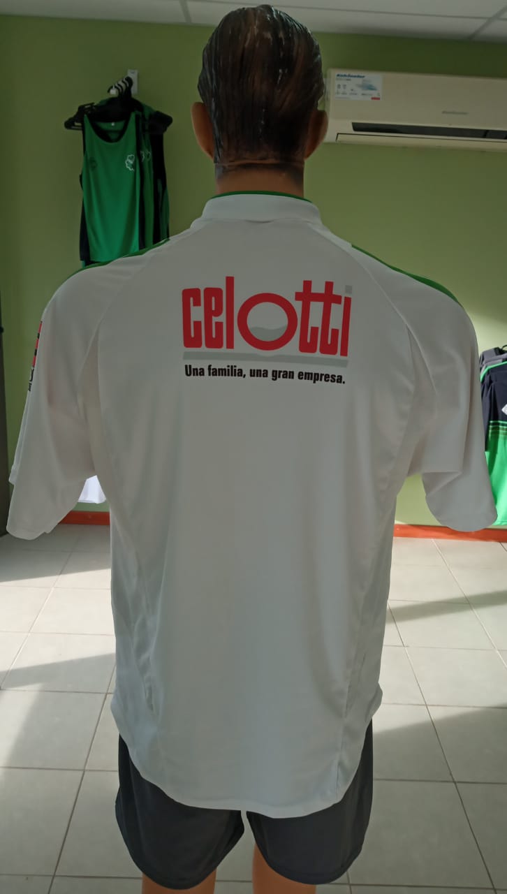 Hoy contamos con una prenda de marca SPORTLANDIA ( una de las más bonitas, de buena calidad en confección y combinación de colores). Cuenta con las publicidades en el pecho de ” Tedeschi ” , en la espalda ” Celotti una familia , una gran empresa ” y en las mangas ” Mutual de Residentes del Barrio Tais ” ” Bingo Interclubes ” . Diseñada en blanco en su mayor parte con la V en verde y dos tiras del mismo color. Está fue utilizada en las campañas de ( 2008-2009 ) y era la alternativa. Nos la prestó muy generosamente Jorge Belleti.